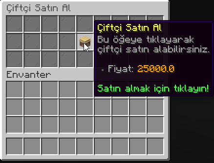 Çiftçi Kemal, oyuncuların mahsüllerini otomatik olarak toplar ve panel aracılığıyla satışa sunar. Böylece çiftçilik işlerinizi kolayca yönetebilirsiniz, tek seferlik 25.000 vererek sahip olursunuz. İlk etapta olmasa da sonrasında kesinlikle işinize yarayacak çiftçi tüm işi sizin yerinize yapar verdiğiniz ücrete kesinlikle değecek!